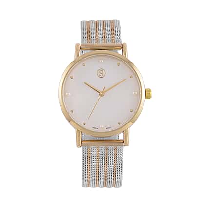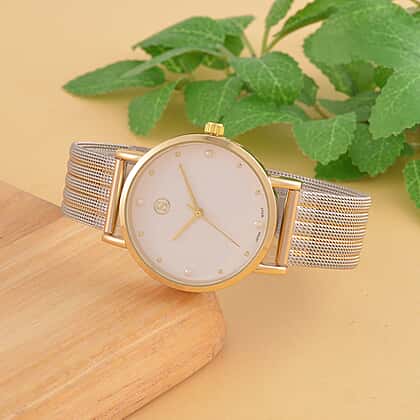 STRADA Japanese Movement White Dial Water Resistant Watch in Gold Tone with Stainless Steel Mesh Strap