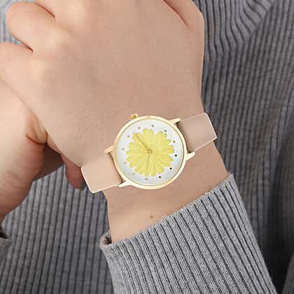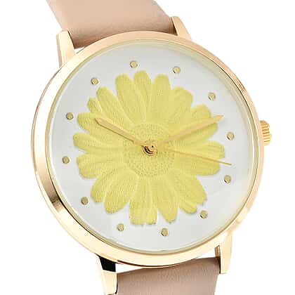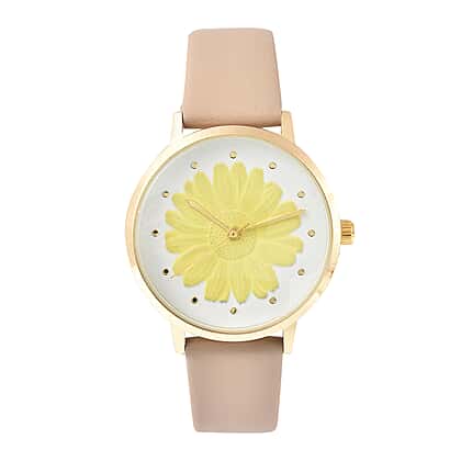 STRADA Japanese Movement Yellow Daisy Floral Water Resistant Watch with Beige Colour Strap
