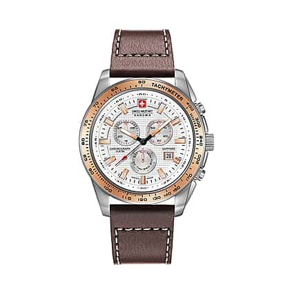 Swiss Military Hanowa Crusader Chrono Mens Watch with White Dial, Rose Gold Bezel and Brown Leather Strap