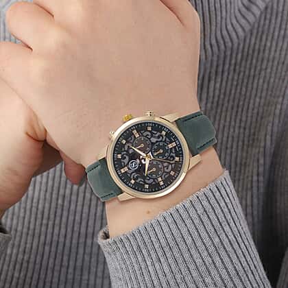 STRADA Multifunction Japanese Movement Crystal Studded 35mm Green Gradient Hollow Literal Dial Gold Overlay Casing With Green Leatherette Strap