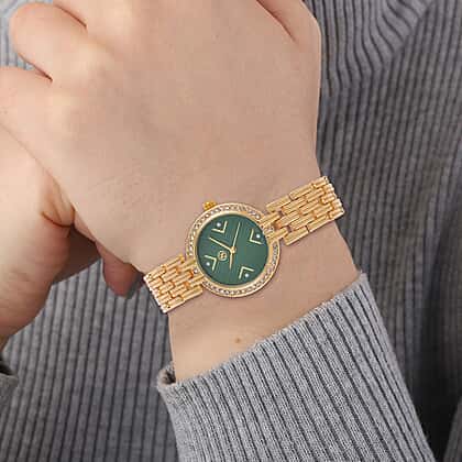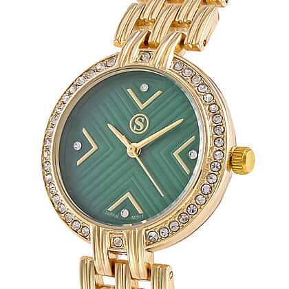 STRADA Japanese Movement Hydraulic Literal & Crystal Green Dial Water Resistant Watch With Stainless Steel Chain Strap in Yellow Gold Tone
