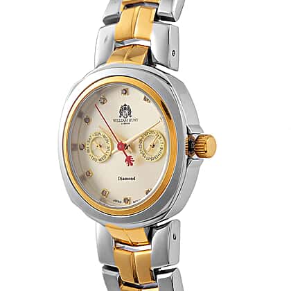 Discover the William Hunt champagne diamond watch, where sophistication meets functionality. This exquisite timepiece features a champagne sunshine dial, adorned with 12 scintillating champagne diamonds, and is secured with a durable stainless steel chain strap in a stunning dual tone. The multifunctional capabilities are powered by a Miyota 6P25 Japan movement, making this watch a statement of luxury and a testament to precision craftsmanship.