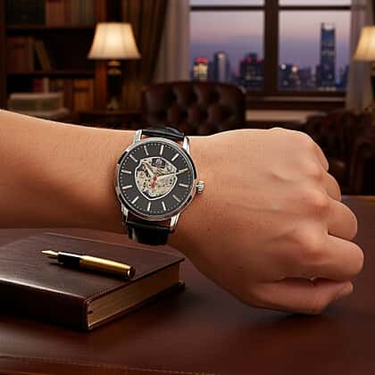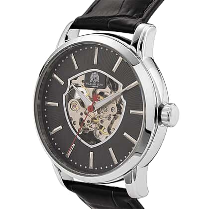 WILLIAM HUNT Automatic Movement 5 ATM Water Resistant Watch With Skeleton Display, Exhibition Back & Black Leather Strap Presented in a Gift Box