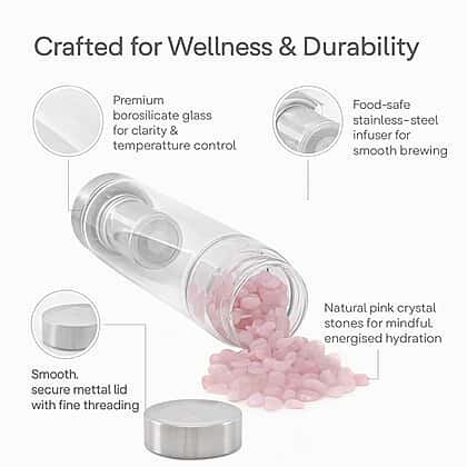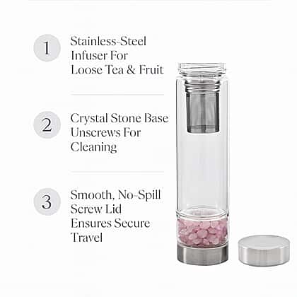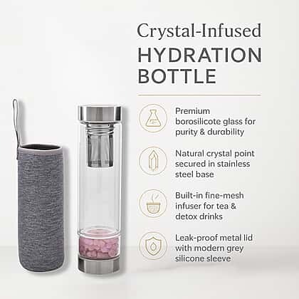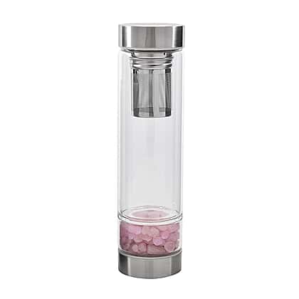 Stay hydrated with our Water Bottle with Crystal Stone & Tea Infuser (450ml) in beautiful rose quartz. This eco-friendly bottle features a built-in tea infuser, allowing you to enjoy your favourite blends on the go. The crystal stone infuses your water with positive energy and promotes emotional healing. The grey cup cover ensures spill-free transportation. Embrace wellness and beauty with this chic and functional water bottle, perfect for a balanced and mindful lifestyle.