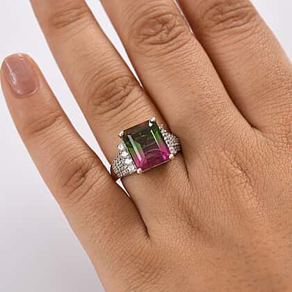 Watermelon Quartz Triplet & White Zircon Cocktail Ring in Rhodium Overlay Sterling Silver 7.17 Ct.