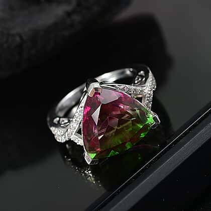Watermelon Quartz Triplet & White Zircon Ring in Rhodium Overlay Sterling Silver 8.53 Ct.