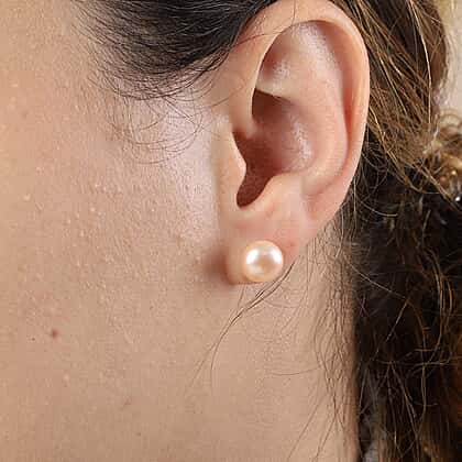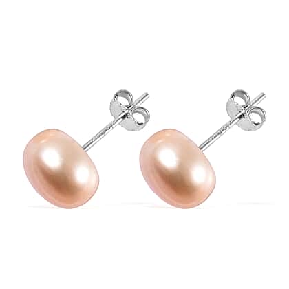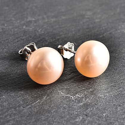 Peach Fresh Water Pearl Stud Earrings With Push Back in Rhodium Overlay Sterling Silver 7.00 Ct