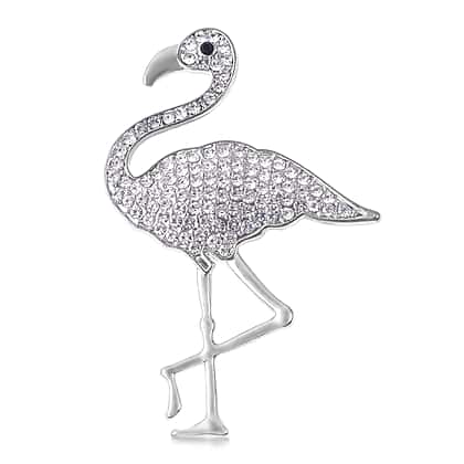 White and Black Austrian Crystal Crane Brooch in Silver Tone