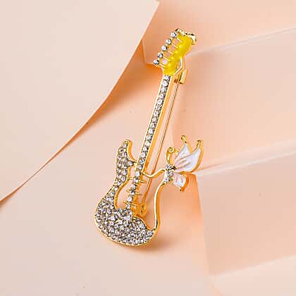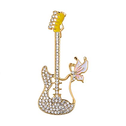 White Austrian Crystal Guitar Brooch in Yellow Gold Tone
