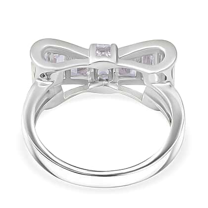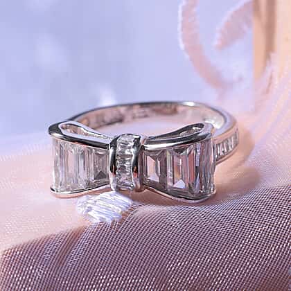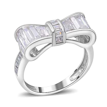 Turning a formal clothing accessory into a fascinating ornament, this White Cubic Zirconia Ring completes your fashionable ensemble. The brilliant ring is lit up by zirconia baguettes paving a bow shaped top that sits over a Sterling Silver base. Rhodium Overlay complements the radiance of the zirconia-set crown with its magnificent sheen.