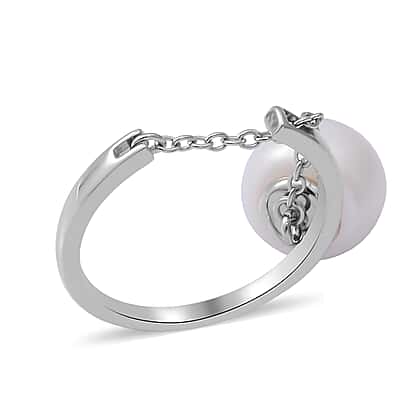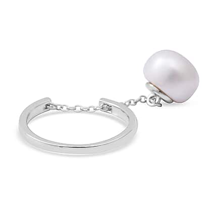 White Freshwater Pearl Chain Ring in Rhodium Overlay Sterling Silver