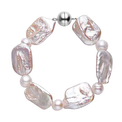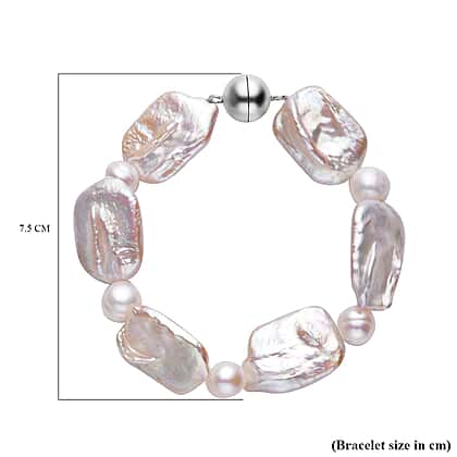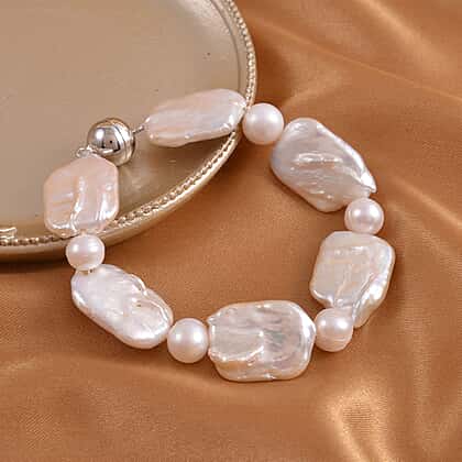 White Keshi Pearl and White Fresh Water Pearl Bracelet (Size - 7) With Magnetic Lock in Rhodium Overlay Sterling Silver
