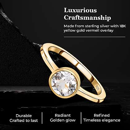 Experience timeless elegance with the white topaz solitaire ring. This exquisite ring features a stunning white topaz round, popular for its brilliance and clarity. The ring's classic design is perfect for any occasion, adding a touch of sophistication to your look. Crafted in 18K vermeil yellow gold plated sterling silver, this ring ensures durability and a luxurious finish. White topaz is known to symbolise clarity and truth, making this ring not only beautiful but also meaningful. Perfect for everyday wear and special occasions, it's a must-have addition to any jewellery collection.