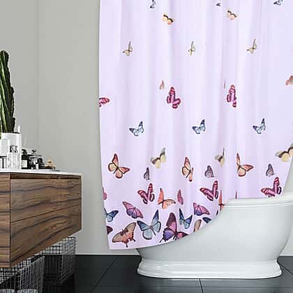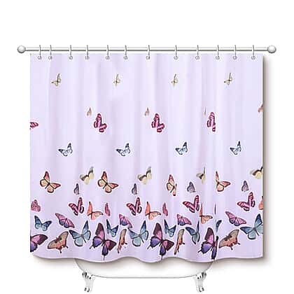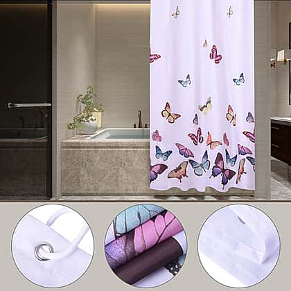 White Waterproof Shower Curtain with Butterfly Pattern and 12 Hooks Size 180x180cm