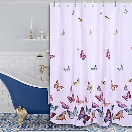White Waterproof Shower Curtain with Butterfly Pattern and 12 Hooks (180x180cm)