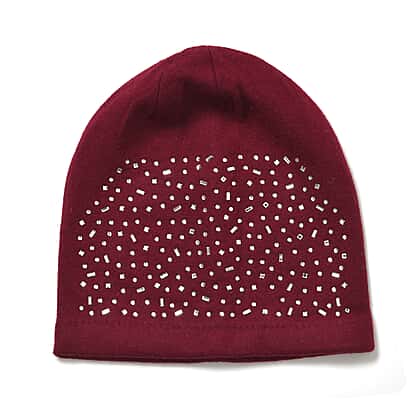 Premium Cashmere Wool Crystal Embellished Hat and Gloves - Burgundy