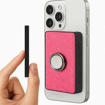 Stay powered up on the go with the Eggtronic Wireless Power Bank in Pink. Its 360° foldable ring allows for easy one-handed texting or a horizontal stand to watch videos hands-free while charging your device. With a 1,500mAh battery capacity, it ensures efficient and fast charging for your smartphone and other compatible devices. Its sleek design, combined with wireless charging capabilities, makes it a perfect companion for your daily adventures.