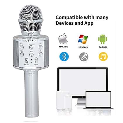 Wireless Rechargable Karaoke Microphone with Bluetooth Speaker (Size 23 Cm) - Silver
