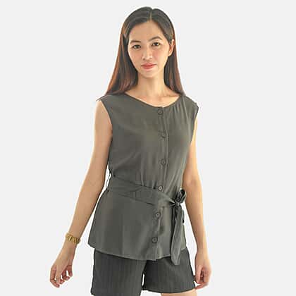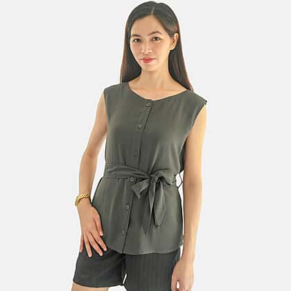 Style this casual and comfortable women's short-sleeved top with a waist belt. This fitted V-neck top has a relaxed fit and soft fabric you can wear all day. It has button front detailing with a tie waist for that perfect fit.