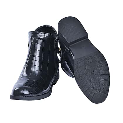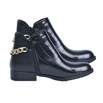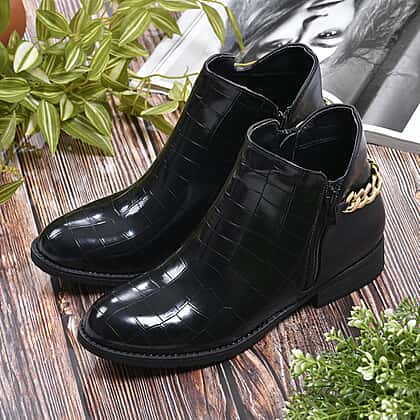 Croc Embossed Pattern Curb Chain Detail Ankle Boots - Black