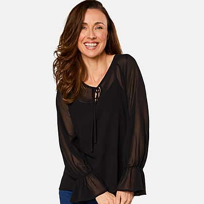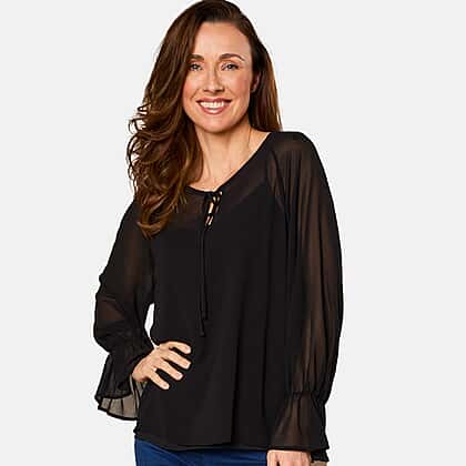 Slip into easy sophistication with the EMRECO 2-in-1 long sleeve sheer frill top in black. Designed with a lightweight sheer overlay and an attached camisole, it offers stylish coverage without bulk. The lace-up neckline adds a touch of charm, while the soft frill cuffs bring gentle movement to every gesture. Perfect for pairing with jeans or trousers, this versatile top transitions seamlessly from day to evening. Crafted from breathable, easy-care fabric, it’s ideal for women who love comfort with polish—an effortless wardrobe staple that looks and feels beautifully put together.