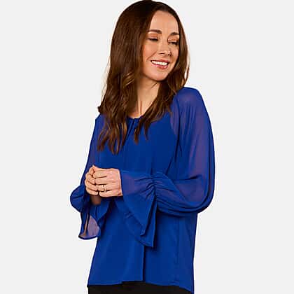 Brighten up your everyday style with the EMRECO 2-in-1 long sleeve sheer frill top in blue. The sheer outer layer flows beautifully over a co-ordinated camisole, giving a light and flattering drape. With its tie-up neckline and delicate frill cuffs, it adds a touch of refined ease to any look. Ideal for both office and weekend wear, it blends comfort and style effortlessly. The easy-care, lightweight fabric keeps you cool and confident from morning to night—making this piece an instant favourite in your collection.