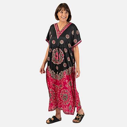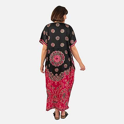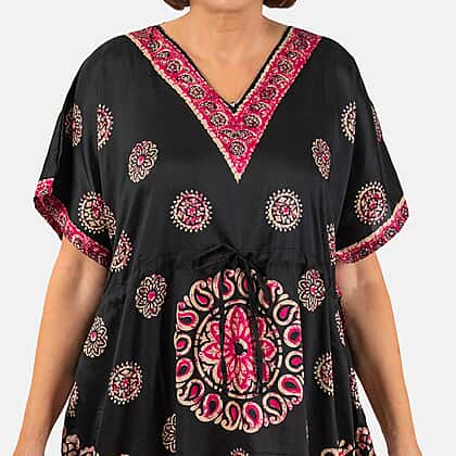 Printed Kaftan with Micro Drawstring at Waist (One Size) - Black & Pink