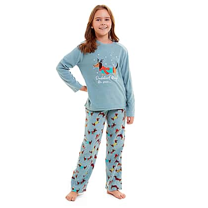 Childrens Dachshund Micro Fleece Pyjamas with Applique Top & Printed Trouser (Size 3-4) - Blue