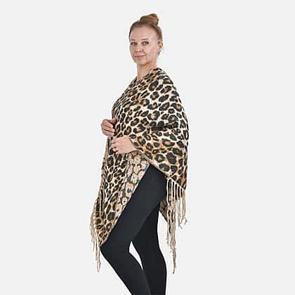 Closeout Deal - Leopard Pattern V-Neck Poncho Tassel Detailing