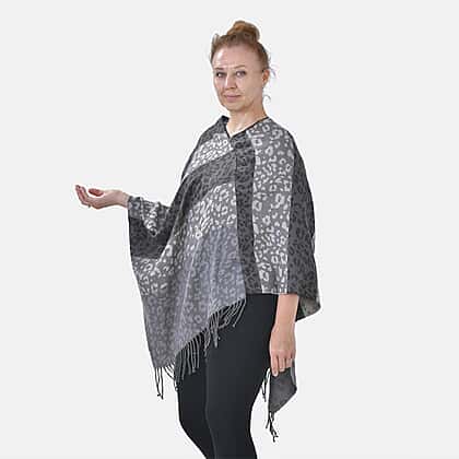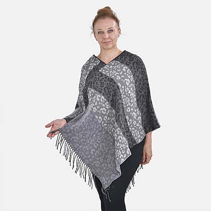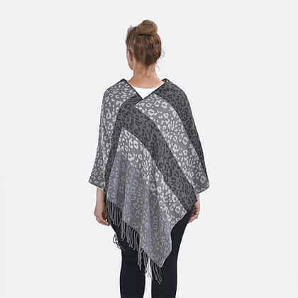 Closeout Deal - Leopard - Stripe Pattern V-Neck Poncho (One Size) - Grey - Black