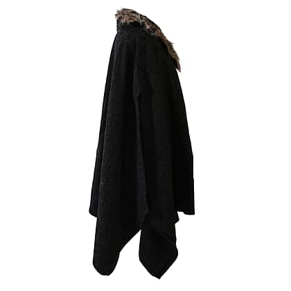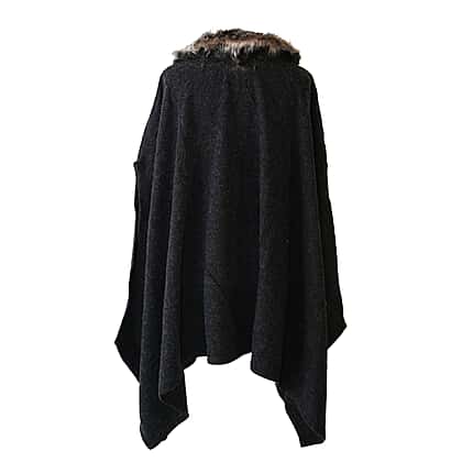 Dark Grey Faux Fur Collar Poncho with Asymmetrical Hem in Black (One Size)