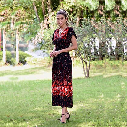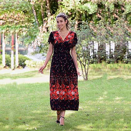 JOVIE Floral Pattern Smocked Waist Maxi Dress with Flutter Sleeve - Black and Red
