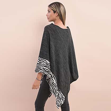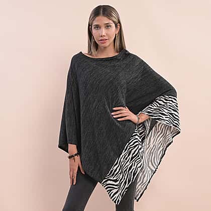 Knit Poncho with Zebra Print Border - Black and White