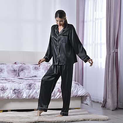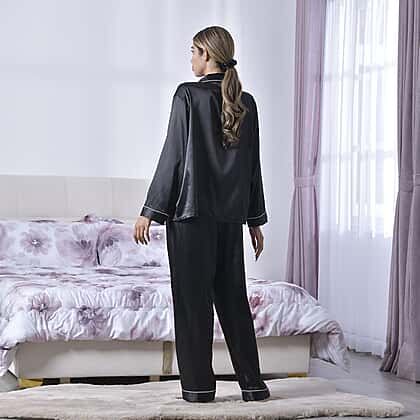 A matching shirt, pair of pants, eye mask, drawstring bag, and elastic hair band are all included in the 5-piece La Marey brand sleepwear set. Shirt with a notch collar, a front button, and a chest pocket. calming and cosy, perfect for a cosy atmosphere. The edges of the collar, front placket, sleeves, and pant hem are defined by attractive piping. To unwind, use a soft sleep mask. A silky smooth hair band lessens tangling and breakage. A full set for peaceful sleep.