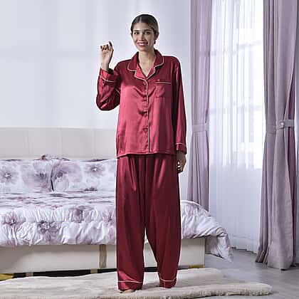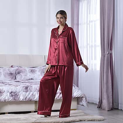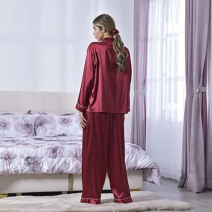 A matching shirt, pair of pants, eye mask, drawstring bag, and elastic hair band are all included in the 5-piece La Marey brand sleepwear set. Shirt with a notch collar, a front button, and a chest pocket. The edges of the collar, front placket, sleeves, and pant hem are defined by attractive piping. To unwind, use a soft sleep mask. A silky smooth hair band lessens tangling and breakage. A full set for peaceful sleep.