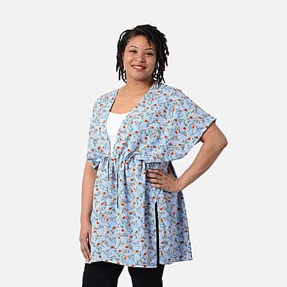 Floral Pattern Shirt with Waist Belt (One Size) - Blue