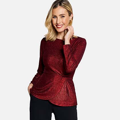 Make a style statement with this shimmer knot top. Designed with a glittery fabric, this top features a wrap bodice silhouette, long sleeves and a round neck. Ideal for the festive season.
