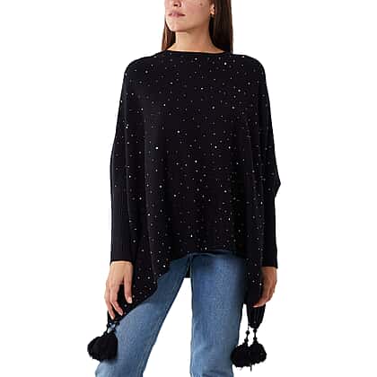 NOVA OF LONDON Diamante Heatseal Tassel Oversized Poncho Women's Jumper - Black