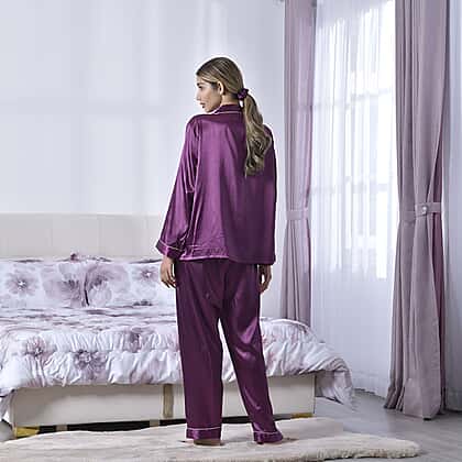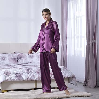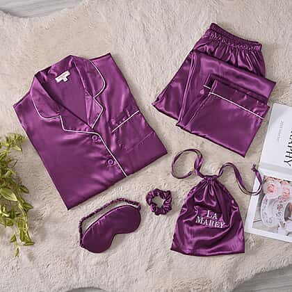 A matching shirt, pair of pants, eye mask, drawstring bag, and elastic hair band are all included in the 5-piece La Marey brand sleepwear set. Shirt with a notch collar, a front button, and a chest pocket. calming and cosy, perfect for a cosy atmosphere. The edges of the collar, front placket, sleeves, and pant hem are defined by attractive piping. To unwind, use a soft sleep mask. A silky smooth hair band lessens tangling and breakage. A full set for peaceful sleep.