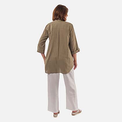 Get this classic half-placket shirt by Tamsy as your everyday wardrobe collection. This shirt is made from linen and viscose blend fabric and has three-quarter sleeves. It has a placket-style collar with a buttoned front to give it a stylish look. Wear it with jeans, leggings or jeggings to complete the look.