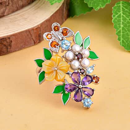 Yellow Mother Of Pearl & Multi Gemstone Floral Ring in Rhodium Overlay Sterling Silver with Enamelling 3.74 Ct, Silver Wt. 6.09 Gms.