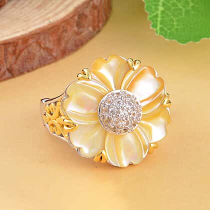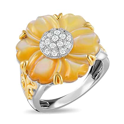 Yellow Mother Of Pearl & Natural Zircon Floral Ring in Rhodium and 18K Vermeil Yellow Gold Plated Sterling Silver 6.34 Ct, Silver Wt. 6.10 Gms.