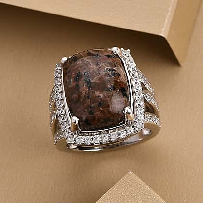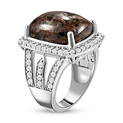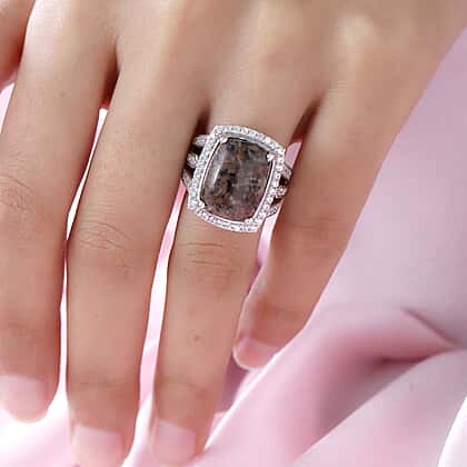 Yooperlite and Natural Cambodian Zircon Ring in Platinum Overlay Sterling Silver 12.01 ct, Silver Wt. 6.37 Gms