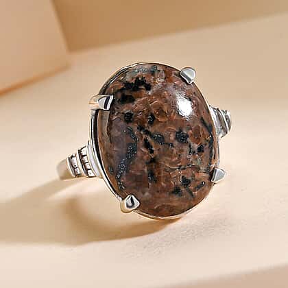 Be unique are flaunt differently with this yooperlite and diamond ring. The enchanting brown-coloured yooperlite glows magnificently in UV light. The cabochon cut yooperlite is secured with prongs in the centre with the tapered baguette cut diamonds making the shoulders invaluable. The master artwork by expert artisans has been crafted in solid sterling silver with platinum overlayed to make this ring look brighter and corrosion-resistant.